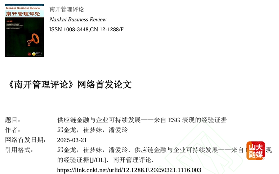 [本站讯]近日,管理学院潘爱玲教授团队在《南开管理评论》在线发表题为《供应链金融与企业可持续发展——来自ESG表现的经验证据》的最新研究成果。管理学院助理研究员邱金龙为第一作者,博士研究生崔梦妹为第二作者,潘爱玲教授为通讯作者。