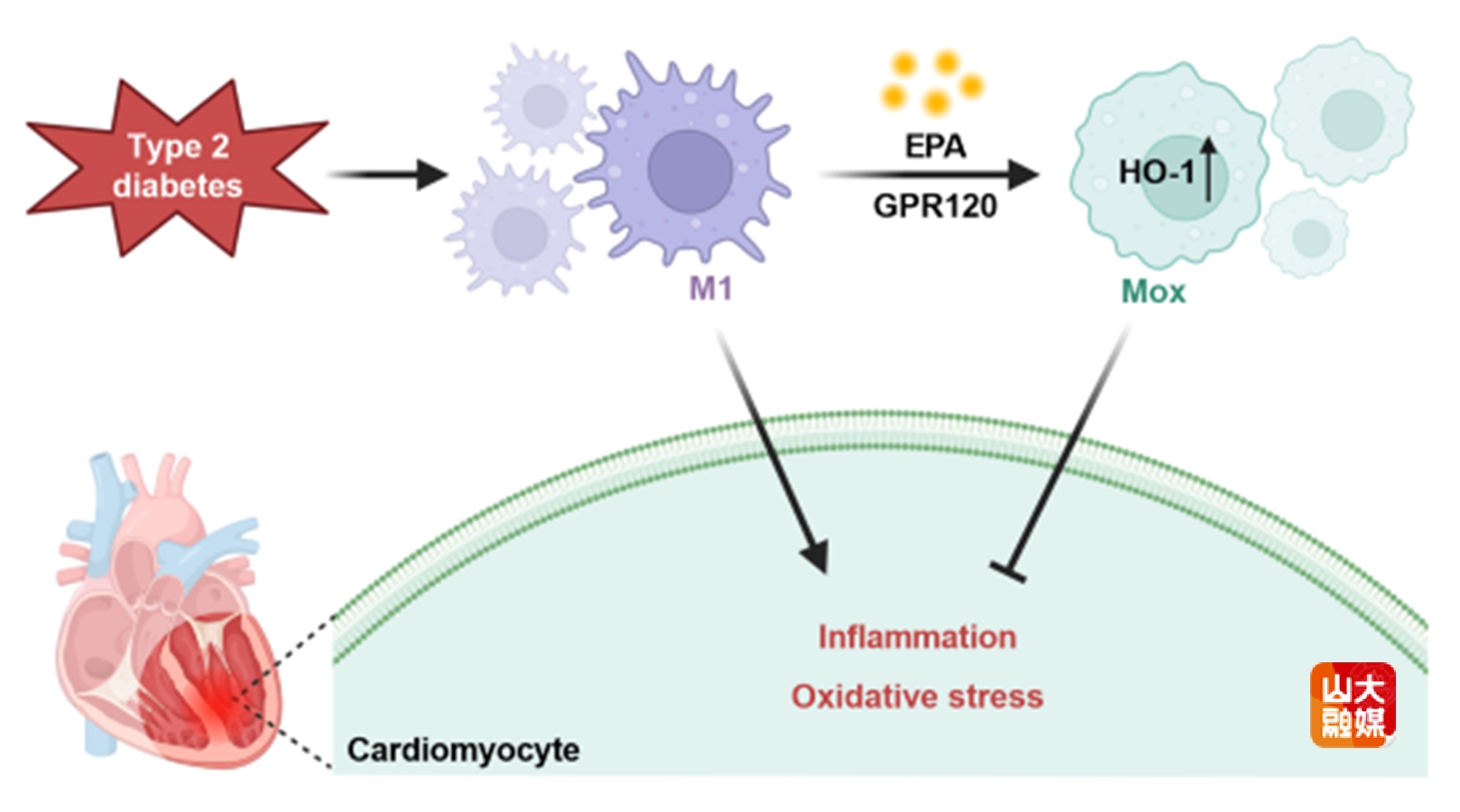 发表在EMBO reports的研究中,团队发现EPA可显著减轻2型糖尿病小鼠心脏功能障碍和病理损伤,尤其可减少心脏中M1型极化巨噬细胞的数量。在细胞水平,EPA将小鼠巨噬细胞从促炎的M1型转变为抗氧化的Mox型,而非抗炎的M2型,进而对抗M1型巨噬细胞所致心肌细胞损伤,该现象在糖尿病患者的巨噬细胞中得到验证。转录组测序及分子生物学研究发现并确定了血红素加氧酶1(Heme oxygenase 1, HO-1)作为维持巨噬细胞Mox表型的基石分子,介导了EPA的保护作用,进一步研究发现EPA通过作用于巨噬细胞表面G蛋白偶联受体120上调HO-1表达。
