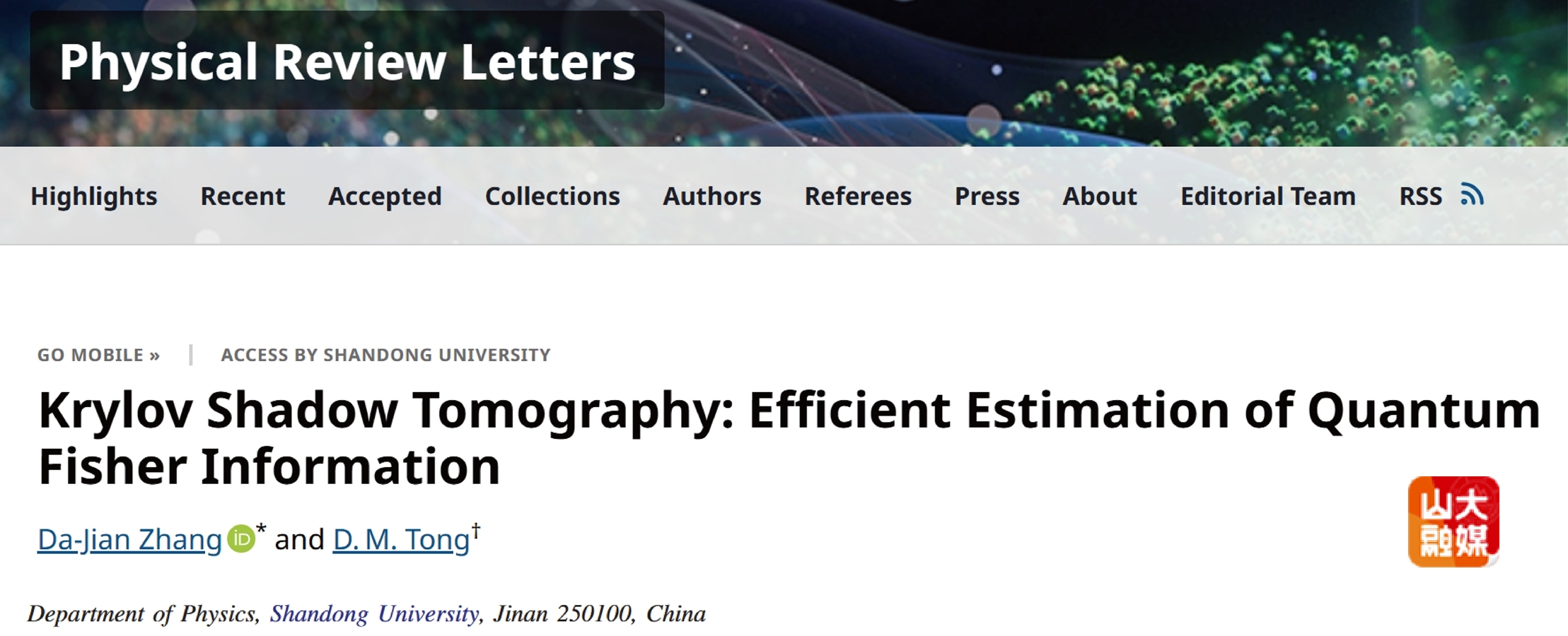 [本站讯]物理学院量子信息团队教授张大剑、仝殿民在量子测量研究领域取得新进展,提出了基于Krylov子空间的量子测量理论,为高效估计量子Fisher信息开辟了新途径。研究成果以“Krylov shadow tomography: Efficient estimation of quantum Fisher information”为题发表在物理学顶级期刊Physical Review Letters[PRL 134,110802,2025]。张大剑教授是文章第一作者,仝殿民教授是通讯作者,山东大学物理学院是唯一单位。