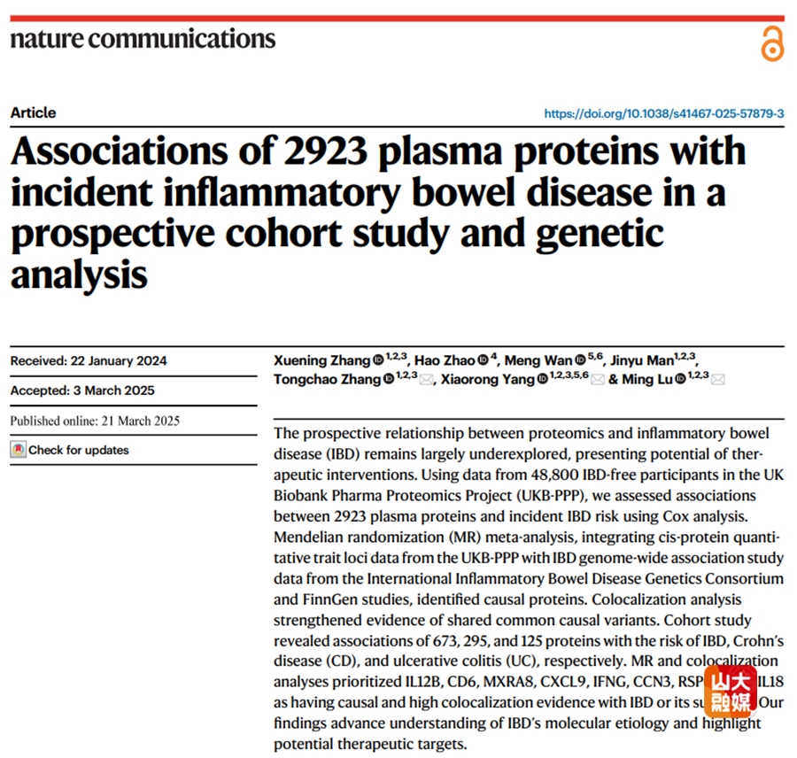 [本站讯]近日,山东大学齐鲁医院临床流行病学研究室吕明教授团队在Nature Communications(中科院1区,IF=14.7)发表题为“Associations of 2923 plasma proteins with incident inflammatory bowel disease in a prospective cohort study and genetic analysis”的研究论文。山东大学齐鲁医院教授吕明、副研究员杨孝荣、院聘副研究员张同超为论文共同通讯作者,山东大学博士研究生张雪凝为论文第一作者,山东大学齐鲁医院为第一和通讯作者单位。