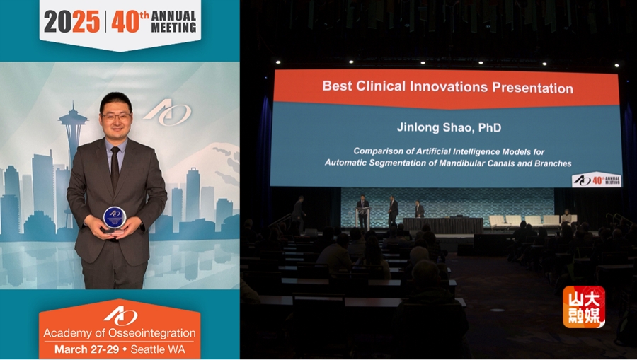 在临床创新报告板块,共从全球挑选了14名报告者竞逐“最佳临床创新报告奖”。邵金龙副教授汇报的题为“Comparison of Artificial Intelligence Models for Automatic Segmentation of Mandibular Canals and Branches”临床研究报告,对比了目前基于卷积神经网络及Transformer架构的人工智能模型用于进行神经管的分类,通过实验对模型的性能进行了对比,并基于神经管的解剖特征予以优化,最终发现了最优的模型并提出了有效的优化方案,为未来相关领域的研究探索奠定了基础。