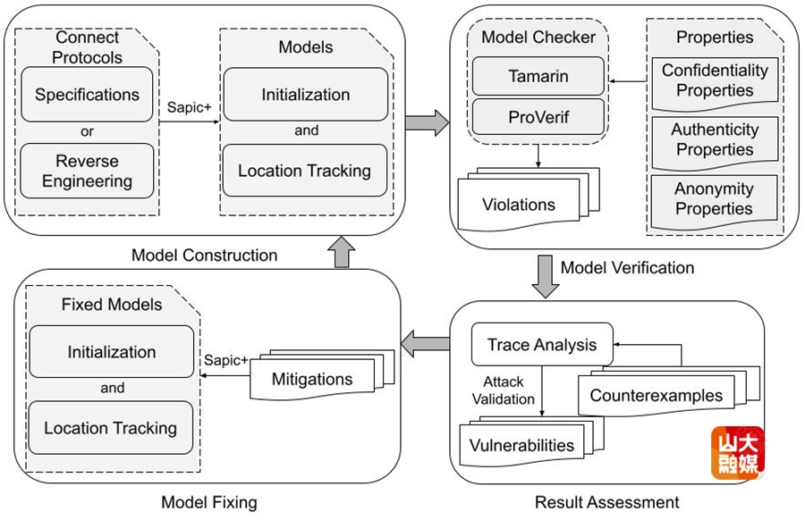 随着智能手机等移动设备的普及以及蓝牙低功耗(BLE)技术的发展,通过引入众包辅助定位设计,BLE近距离设备追踪的覆盖范围从几十米扩展到了全球范围。之前的研究缺乏全协议流程的视角,及其安全分析因缺乏形式化保障,从而缺少对这些协议进行系统性和全面性分析的研究。为此,本研究提出了一个系统且全面的分析方案:一方面,通过逆向工程恢复闭源协议;另一方面,基于逆向工程结果构建形式化模型,并提取和形式化这些协议设计所需满足的安全目标,最后对这些安全目标是否能够得到保障进行形式化验证。本研究对两种最流行的近距离追踪服务:Apple Find My 和Samsung Find My Mobile,进行了逆向工程与形式化验证。该工作揭示了7个新漏洞,包括3个高危漏洞,并获得相关厂商的确认与致谢。三星在郭山清教授团队的帮助下已修复了5个漏洞,并分配了5个SVE编号。