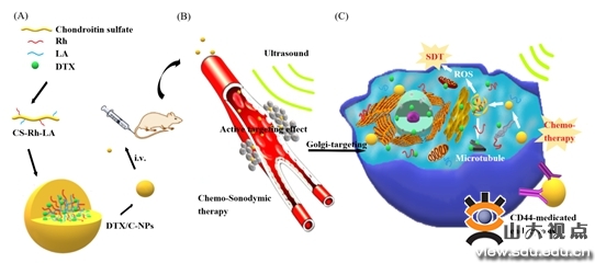 本研究以对肿瘤细胞CD44受体具有靶向作用的天然多糖硫酸软骨素为亲水骨架,以具有良好抗肿瘤作用并可作为超声敏感剂的大黄酸和可形成二硫键的α-硫辛酸作为疏水物质,形成自组装纳米粒,在α-硫辛酸作为交联剂的作用下,形成纳米粒的分子间二硫键,该纳米体系可实现在肿瘤微环境下的氧化还原敏感释药,将靶向化疗作用与声动力治疗作用联合于一体,产生了显著的协同抗肿瘤效果。