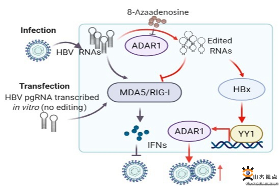 RNA特异性腺苷脱氨酶(ADAR1)能够催化双链RNA中的腺苷(A)脱氨基为肌苷(I),从而改变RNA二级结构,是宿主区分自我与非我RNA的重要机制。该研究发现ADAR1能够结合并编辑HBV RNAs,抑制模式识别受体RIG-I/MDA5对HBVRNAs的结合,从而负调控IFN信号通路活化,并促进HBV复制。HBV X蛋白通过转录因子YY1反式激活ADAR1转录,上调免疫识别阈值,促进HBV逃避宿主免疫识别。干预ADAR1有效增强肝脏免疫功能,促进HBV清除。本研究揭示了HBV劫持ADAR1促进病毒免疫逃逸的分子机制,为开发更有效的HBV治疗策略提供了理论基础。
