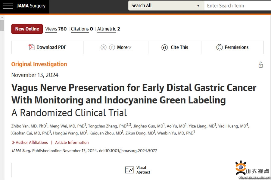 [本站讯]近日,山东大学齐鲁医院普通外科于文滨/闫治波教授团队在国际外科学顶级期刊JAMA Surgery(中科院1区Top,2024年 IF=15.9)在线发表了题为“Vagus Nerve Preservation for Early Distal Gastric Cancer With Monitoring and Indocyanine Green Labeling A Randomized Clinical Trial”的研究论文。该研究在国际上首次提出保留部分迷走神经胃前支、胃后支和肝支的远端胃癌根治术,术中联合应用神经监测仪及吲哚菁绿标记荧光腹腔镜对神经进行定位、保护,同时保证淋巴清扫的彻底性。随访发现该术式患者胃瘫发生率明显下降,生命质量测定量表EORTC QLQ- STO30及STO22满意度提高,为早期远端胃癌根治术的保功能手术方式选择提供了新的思路。山东大学齐鲁医院普通外科副教授闫治波、主治医师魏猛为该论文的共同第一作者,于文滨教授为该论文的通讯作者,山东大学齐鲁医院为该论文的第一作者和通讯作者单位。
