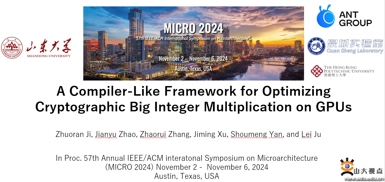 [本站讯]近日,第57届微架构国际研讨会(The 57th Annual IEEE/ACM International Symposium on Microarchitecture, MICRO 2024)在美国奥斯汀召开。网安学院体系结构与可信系统团队论文“A Compiler-Like Framework for Optimizing Cryptographic Big Integer Multiplication on GPUs”被该会录用,网安学院助理研究员纪卓然是该论文的第一作者,并受邀作口头报告,通讯作者为网安学院教授鞠雷。这是山东大学首次以第一完成单位及通讯作者单位在MICRO上发表论文,论文合作单位包括蚂蚁集团、香港理工大学和泉城实验室。