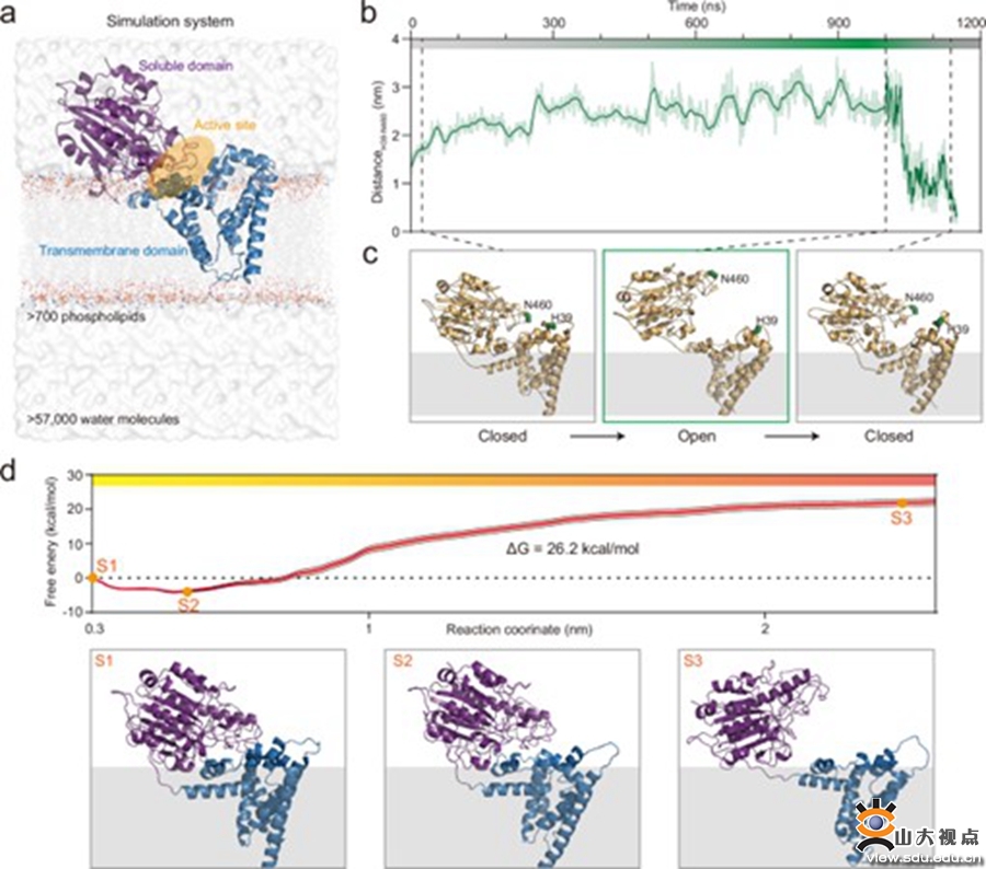 本研究通过微秒级的全原子分子动力学模拟,重建了EptA从关闭构象到开放构象的动态循环过程,发现PE和Re LPS通过不同的路径进入EptA的底物结合口袋。结合虚拟突变和进化动力学分析,发现EptA结构域界面的相互作用是动态的,并受到底物PE结合的调节。特别是可溶结构域与细胞膜的相互作用被发现是维持开放构象的关键因素。同时,EptA催化引起的局部脂质环境变化影响了EptA与细胞膜之间的相互作用,从而调控了两种构象之间的转变。总之,EptA的构象动态与催化功能受膜脂质微环境的调控,尤其是PE脂质的局部浓度,本研究提出了一种受脂质微环境影响的膜蛋白自我调控模型,并为细菌耐药性与生存之间的平衡提供了新的见解。
