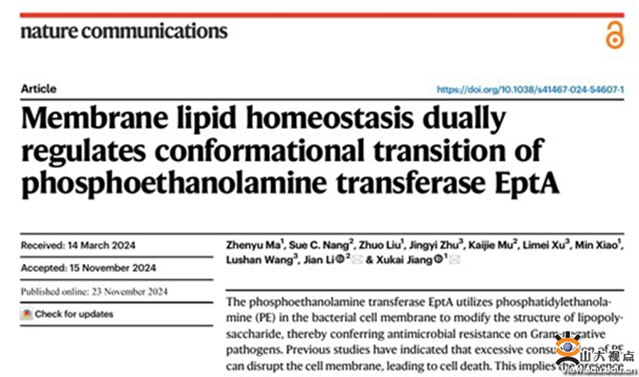 [本站讯]近日,国家糖工程技术研究中心肖敏课题组蒋绪恺团队在膜脂质调控膜蛋白功能的分子机制方面取得重要进展,相关研究成果以“Membrane lipid homeostasis dually regulates conformational transition of phosphoethanolamine transferase EptA”为题发表在Nature Communications期刊。山东大学强基计划生物方向研究生马振宇为论文第一作者,山东大学副研究员蒋绪恺、莫纳什大学教授李健为论文通讯作者,山东大学为第一完成单位和通讯作者单位。