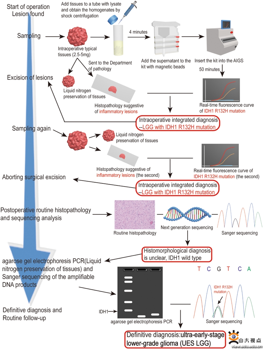 在神经外科手术中,部分低级别胶质瘤在形态学上难以与“胶质细胞增生或炎性改变”相区别,而术中快速冰冻组织病理诊断由于缺乏免疫组织化学染色支持,也容易产生“误判”,在一定程度上影响了手术策略和治疗效果。因此,如何能快速精准地将低级别胶质瘤和“胶质增生或炎性改变”在术中予以鉴别,对于术中手术决策的制定具有重要意义。IDH是胶质瘤诊断中最重要的分子靶点,90%以上的低级别胶质瘤中存在IDH突变,而正常的脑组织中则无突变;如果能准确检出IDH突变并将脑胶质瘤分子诊断窗口提前至超早期阶段,可以显著提高低级别胶质瘤的确诊率,但这无疑对术中分子检测提出了更高的要求。