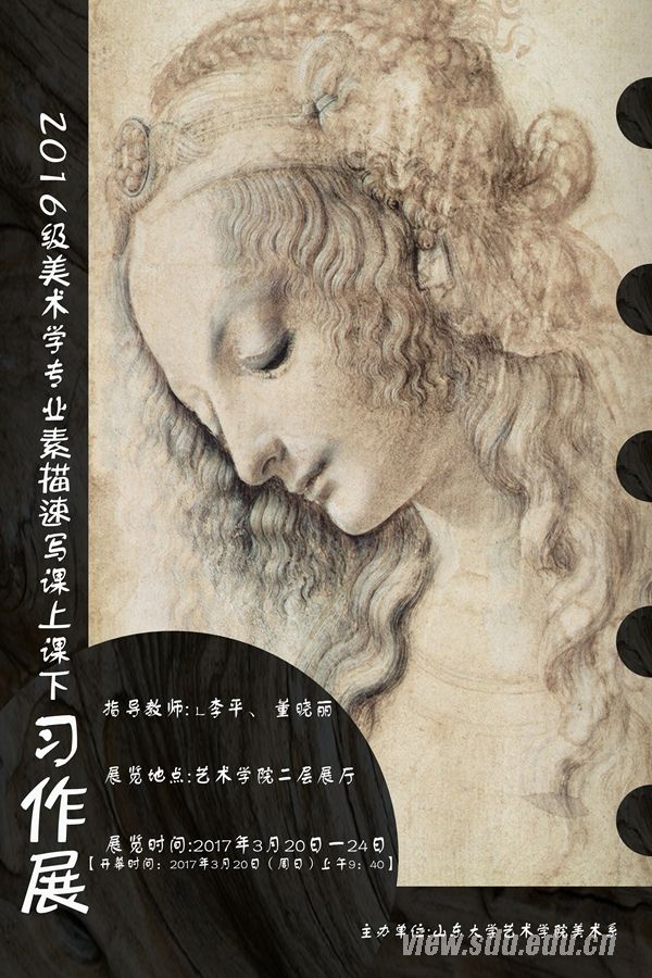 3月20日至24日,在山东大学艺术学院二楼展厅举行2016级美术学素描写生习作展。此次写生由山东大学艺术学院李平教授和董晓丽老师一同指导完成,作品内容主要反映2016级美术学班级同学对写生人物对象视觉化、二维化的感悟与心中对形体、光影和点线面的寻找与尝试。