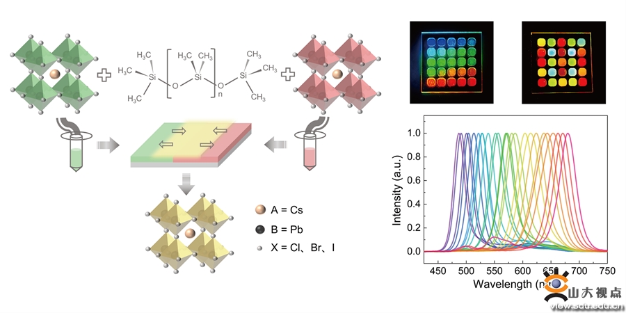 研究中提出的基于波分复用(WDM)技术的全光成像需要每个空间位置像元处均有一种特征光谱,光谱数量越多意味着可实现的空间分辨率越高。钙钛矿纳米晶具有较窄的半峰宽、高量子产率和可调谐的光致发光光谱,可以将紫外光转换至可见光波段进行成像,在该领域有很高的潜在应用价值。通过点胶工艺可以在玻璃基板上实现钙钛矿材料的原位阴离子交换,简化了材料的制备过程。此外,在钙钛矿中混合聚合物PDMS,隔绝了水分和空气的影响、抑制了离子迁移,其稳定性也得到了一定程度的提高。