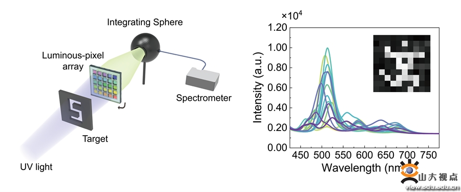 在全光成像过程中,紫外光物体激发PLPA的相应像元。每个像元是不同的钙钛矿-聚合物薄膜,被激发的像元释放出特定的光信号,然后由光谱仪收集。为避免发射光的角度依赖性,在光谱仪之前使用了一个积分球来收集所有的光谱信息。这种方式在目标和空间信息之间建立了相关性,通过并行的光信息传输代替传统成像系统中的空间扫描过程,实现了全光成像。同时,旋转PLPA至不同的角度,在不改变目标空间位置的同时可以得到多条光谱信息,将其联立计算可恢复出更高质量的图像。