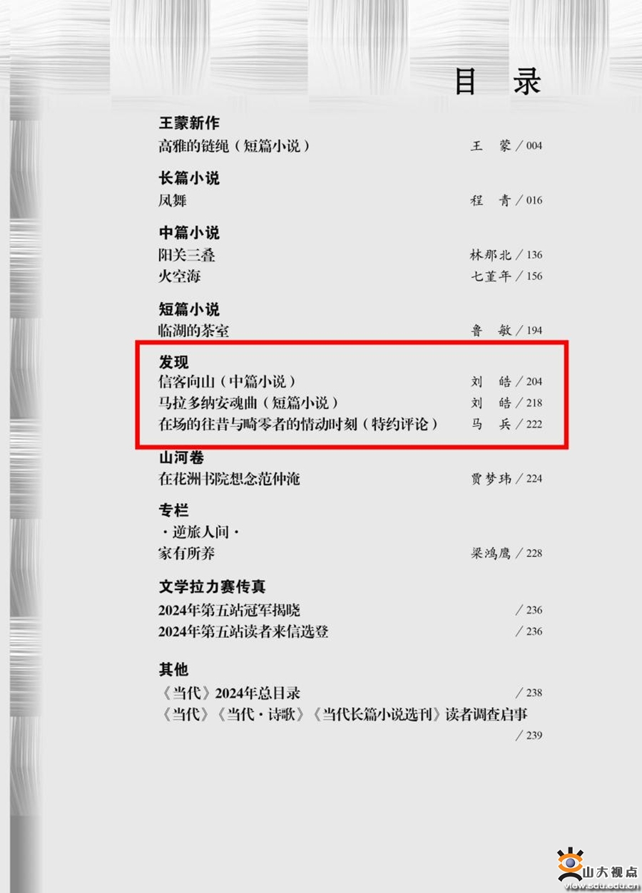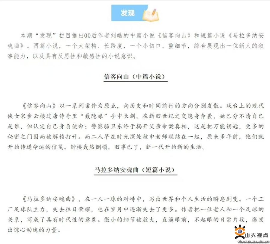 [本站讯]近日,《当代》2024年第6期“发现”栏目发表文学院2021级闻一多班刘皓的中篇小说《信客向山》和短篇小说《马拉多纳安魂曲》。