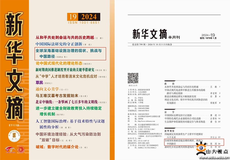 [本站讯]近日,《新华文摘》2024年第19期全文转载东北亚学院副院长张景全、硕士研究生侯闯的论文《全球深海基础设施治理的现状、挑战与中国路径》,并将其作为封面文章进行推荐。