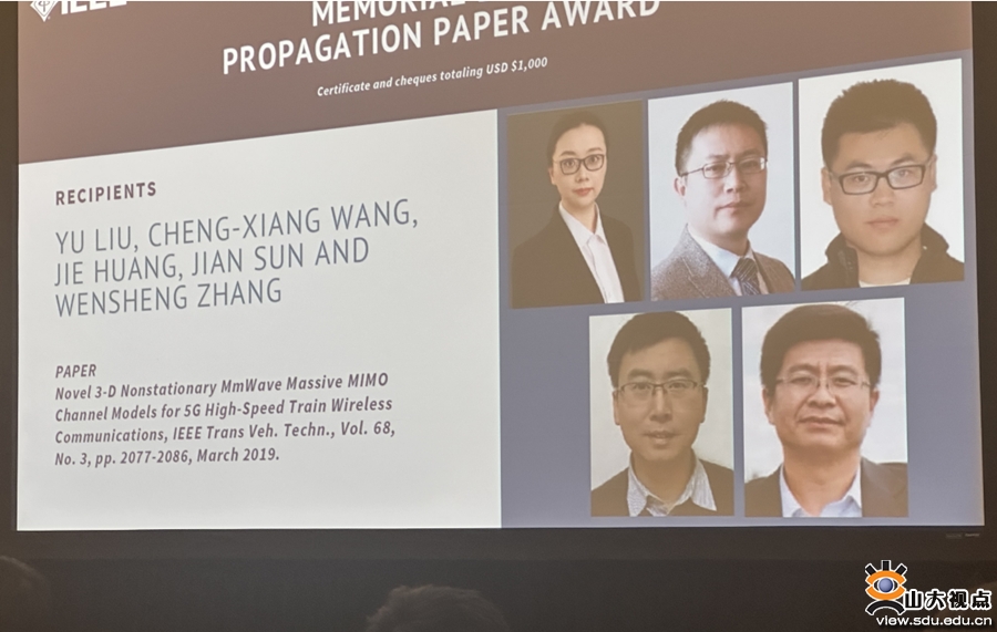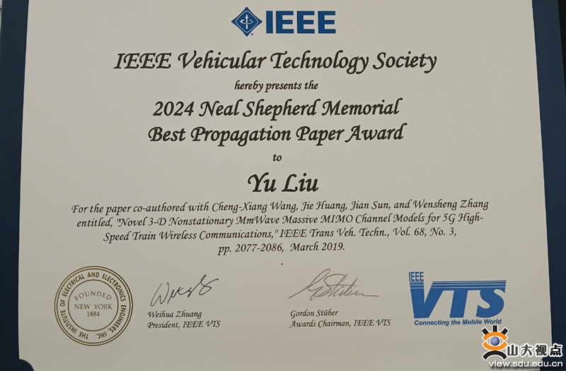 [本站讯]10月7日至10日,国际电气与电子工程师学会(IEEE)第100届车载技术会议(2024 IEEE 100th Vehicular Technology Conference)在美国华盛顿举行。会议颁发了2024年IEEE尼尔谢菲尔德最佳传播论文奖(IEEE Neal Shepherd Memorial Best Propagation Paper Award)。山东大学为第一单位的论文“Novel 3-D Nonstationary MmWave Massive MIMO Channel Models for 5G High-Speed Train Wireless Communications”荣获该奖项。山东大学集成电路学院副教授刘玉为第一作者,合作者依次为东南大学信息科学与工程学院教授王承祥(通讯作者),东南大学信息科学与工程学院副教授黄杰,山东大学信息科学与工程学院副教授孙健、张文胜。这是该奖项自1993年设立以来首篇作者和作者单位均来自中国的获奖论文。