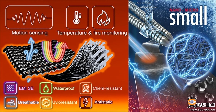 团队针对PTFE微孔材料加工性能差、表面能低而难以实现高填料负载的问题,开发了一种基于PTFE纳米纤维与碳纳米管(CNT)交织的双纳米纤维网络复合材料。该材料集成了高导电性、高机械强度、耐高低温、耐腐蚀性以及疏水透气等优异特性。基于此,团队实现了PTFE/CNT复合微孔纤维的连续化制备,开发出具有极端防护、智能传感和高效热管理功能的多功能纺织品。相关研究发表在Advanced Functional Materials(2024, 2416428),博士毕业生柴佳龙为第一作者。此外,团队还开发了基于PTFE/CNT双纳米网络结构的轻质、柔韧且环境耐受性强的微孔薄膜,用于电磁屏蔽。该薄膜通过纳米尺度CNT与PTFE纤维共同构建的蜘蛛网状结构,结合微孔材料的多重反射作用,在极端环境下表现出优异的电磁屏蔽效果。此项研究作为封面文章发表于Small(2024, 2308992),博士研究生邵润泽为第一作者。