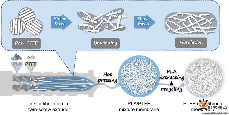 图1. 剪切诱导原位成纤制备PTFE微孔材料工艺示意图