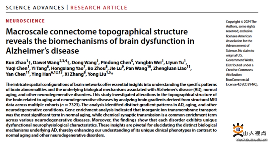 [本站讯]近日,山东大学齐鲁医院与北京邮电大学合作,联合国内多家医院揭示正常老化以及多种神经退行性疾病的脑结构特征表征,以“Macroscale connectome topographical structure reveals the biomechanisms of brain dysfunction in Alzheimer's disease”为题在Science Advances(IF=13.70,中科院1区)上发表文章。北京邮电大学人工智能学院智能医学中心赵坤、山东大学齐鲁医院放射科副教授王大伟为本文的共同第一作者。