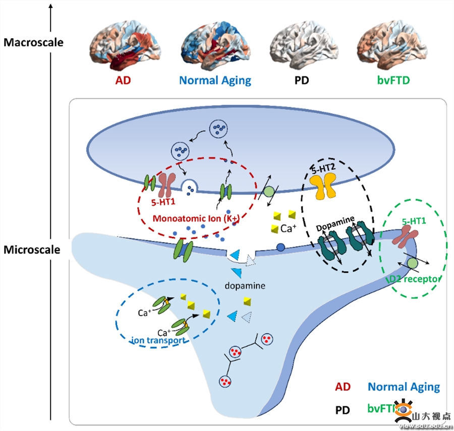 研究发现老化呈现分布广泛但程度轻微的脑结构变化,而AD则呈现出典型的区域损伤,如默认网络和皮下核团,揭示了通过复杂脑网络结构可以更好地捕捉疾病特异性表征。研究进一步探索了不同疾病脑结构异常模式背后潜在的生物机制,结果显示老化主要与离子运输变化相关,不同痴呆类疾病则与化学神经递质异常相关,揭示了痴呆与老化生物过程的差异。此外,研究还揭示了不同痴呆类型之间的特异性,如AD主要与5-羟色胺系统相关,帕金森(PD)主要与多巴胺系统相关,为不同类型痴呆的特异性临床表型提供了生物学依据,也为不同疾病提供潜在干预靶点。