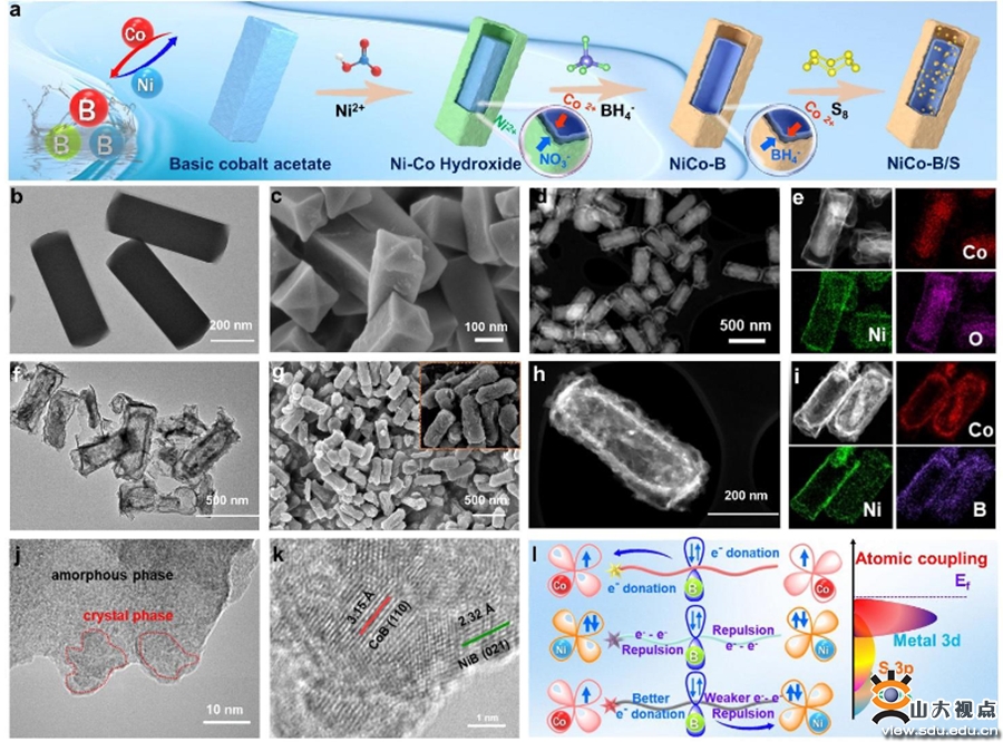 进展二:锂硫电池因其高能量密度而成为最有前途的新型二次电池系统之一。催化Li2S的形成转化过程被认为是提高锂硫电池动力学的关键途径,但锂硫电池存在复杂的催化转化体系,如何利用催化剂实现硫的分级催化行为至关重要。该团队报道了一种新型串联的纳米反应器,通过适当调控前驱体系统和反应动力学,改变离子浓度调控了催化剂的微/钠结构,为实现锂硫电池中的分级催化行为提供了新契机。相关成果以“Manipulating Atomic-coupling in Dual-cavity Boride Nanoreactor to Achieve Hierarchical Catalytic Engineering for Sulfur Cathode”为题发表在国际期刊Angew. Chem.上。化学与化工学院博士后王斌为论文第一作者,徐立强教授为唯一通讯作者,山东大学为第一单位和通讯单位。