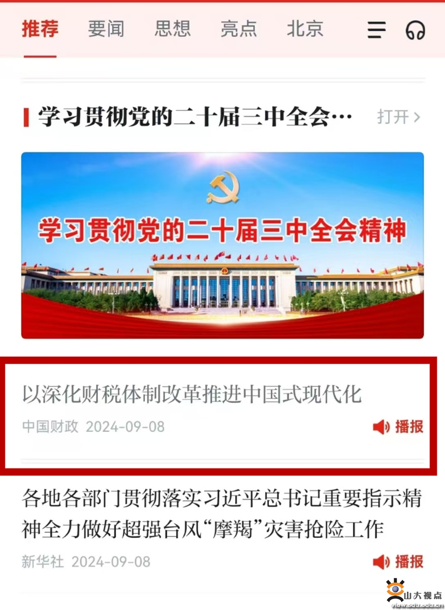 [本站讯]近日,山东大学教授樊丽明在《中国财政》发表题为“以深化财税体制改革推进中国式现代化”的党的二十届三中全会精神研究阐释文章,文章被学习强国首页“学习宣传贯彻党的二十届三中全会”专栏头条推荐。
