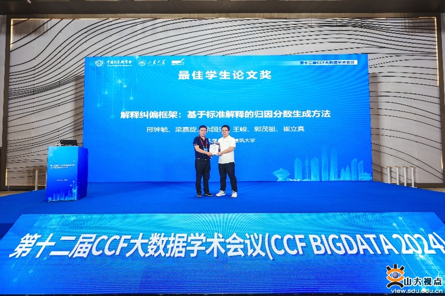 [本站讯]近日,软件学院硕士研究生邢钟毓为第一作者,余国先、王峻、崔立真教授指导的论文“解释纠偏框架:基于标准解释的归因分数生成方法”获得了第十二届CCF大数据学术会议唯一最佳学生论文奖(总投稿219篇)。余国先教授为该论文的通讯作者,第一作者和通讯作者单位均为山东大学软件学院。