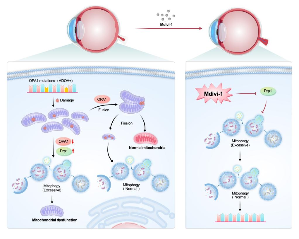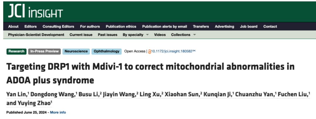 团队在JCI insight(JCR 1区, IF=7.5)发表关于常染色体显性视神经萎缩叠加综合征(Autosomal Dominant Optic Atrophy plus,ADOA+)的研究结果。该病是一种以视神经萎缩为主要特征,并伴有多种神经退行性症状的疾病,约90%的ADOA+病例与OPA1基因突变有关,目前缺乏有效的治疗方法。团队通过研究患者来源的皮肤成纤维细胞和 OPA1 基因下调的HEK293T细胞系,首次对OPA1基因 c.1780T>C变异在ADOA+中的致病性进行了验证,同时进一步研究发现,OPA1缺陷会导致线粒体破碎并使DRP1表达上调,使线粒体稳态失衡、自噬增强、线粒体功能障碍,最终促成ADOA+的表型。由此得到启发,该团队创新性地使用DRP1抑制剂Mdivi-1来进行该病治疗方面的探索,发现Mdivi-1可以有效抑制DRP1蛋白的磷酸化、减少线粒体破碎及过度自噬,从而为ADOA+的临床干预开辟了新的治疗靶点。神经内科博士后林岩为本论文第一作者,焉传祝教授、刘付臣研究员、赵玉英主任医师为本文共同通讯作者。
