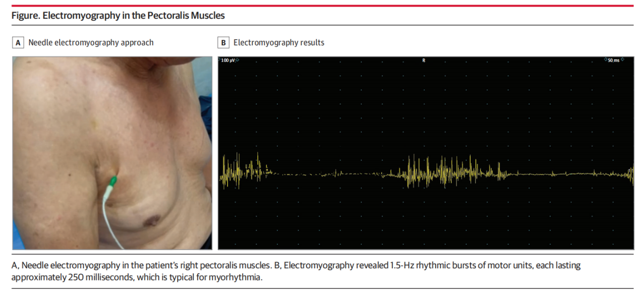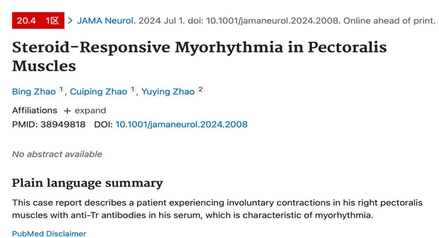 团队在JAMANeurology(JCR 1区,IF=20.4)上,发表了题为“Steroid-Responsive Myorhythmia in Pectoralis Muscles”的病例研究报道。该病例为74岁男性,因“胸大肌不自主地节律性收缩6个月”来院就诊,之前患者曾辗转多家医院,完善过颅脑、颈胸髓磁共振、脑电图、腰穿、肿瘤筛查等多项检查,并尝试过卡马西平、加巴喷丁、氯硝西泮、托吡酯等多种药物,效果均不佳。团队通过临床观察、肌电图和肌骨超声的进一步研究和论证,考虑患者的症状为myorhythmia(肌肉节律性收缩),本病常与中枢神经系统中的“格莫式三角”病变有关,病因不明,免疫因素参与其中。于是为患者筛查扩大抗体谱的自身免疫性脑炎抗体,最终发现患者血清中抗Tr抗体阳性。Tr抗原大部分表达于小脑浦肯野纤维,推测该抗体可能与患者的症状有关,故为患者进行了激素冲击治疗,治疗后患者的症状明显改善。这使得神经内科的临床医生对于该症状的识别、诊断和鉴别诊断、其背后的病理生理机制以及可能存在的病因都有了全新的认识。齐鲁医院青岛院区神经内科赵冰为第一作者,齐鲁医院青岛院区赵翠萍,齐鲁医院赵玉英为共同通讯作者。