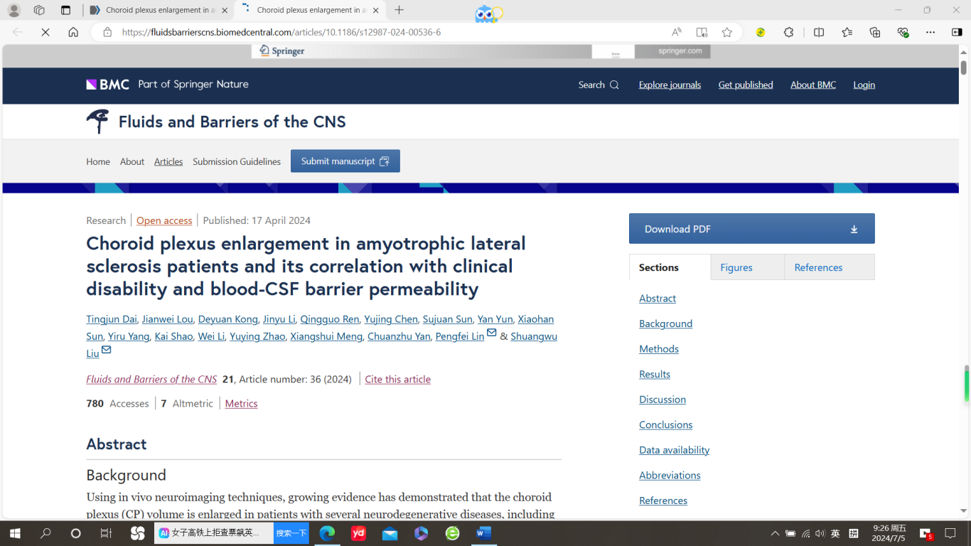 团队在血脑屏障领域顶级期刊Fluids and barriers of the CNS (国际血脑屏障学会、国际脑积水与脑脊液疾病学会官方杂志,JCR 1区,IF=7.5)发表题为“Choroid plexus enlargement in amyotrophic lateral sclerosis patients and its correlation with clinical disability and blood-CSF barrier permeability”的研究报道。肌萎缩侧索硬化(ALS)是一种致死性的神经系统变性疾病,发病机制未明。本研究通过先进的磁共振成像技术,首次发现ALS患者存在显著的大脑脉络丛扩张,且脉络丛体积与血脑屏障通透性指数密切相关,提示脑室脉络丛结构可能是ALS患者重要的治疗靶点。该结果进一步拓展了对脑室脉络丛结构与神经变性疾病之间关系的理解。神经内科戴廷军、娄建伟为共同第一作者,林鹏飞、刘双武为共同通讯作者。