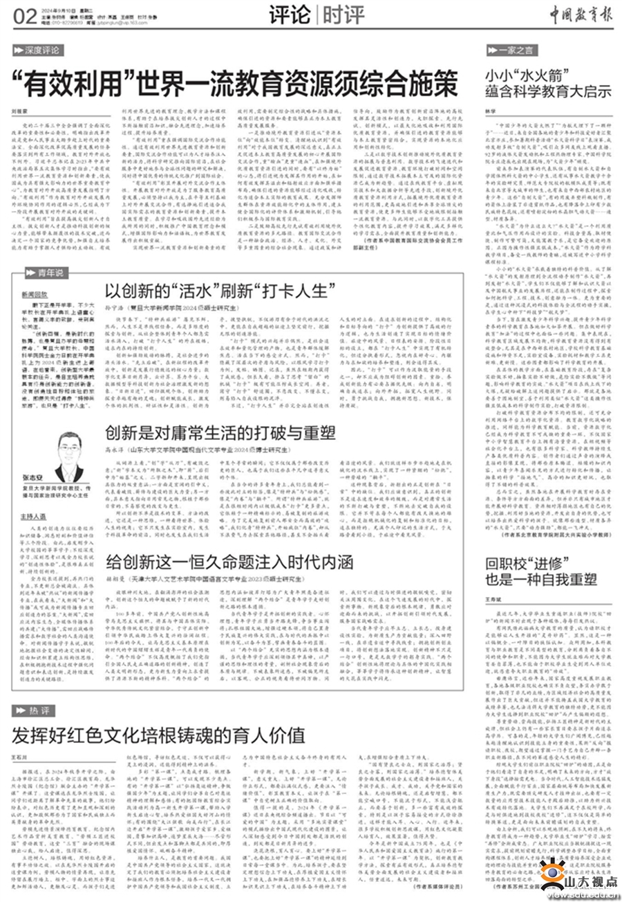 [本站讯]9月10日,正值教师节来临之际,《中国教育报》“青年说”栏目发表了文学院2024级博士研究生高永淳的评论文章,题为《创新是对庸常生活的打破与重塑》。