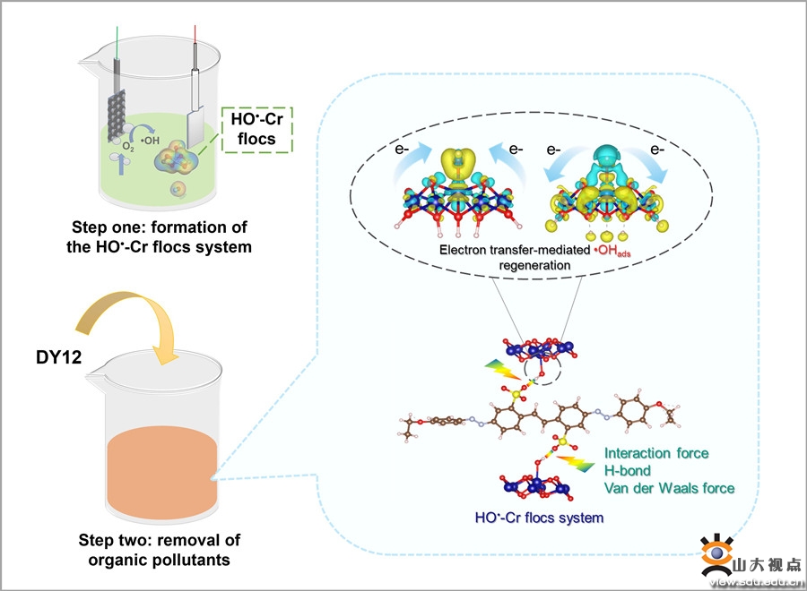 研究团队采用分步法揭示了吸附•OH的Cr絮体(HO•-Cr絮体)长效去除有机污染物的途径。首先,证明了HO•-Cr絮体中吸附的•OH是与有机污染物间形成氢键和范德华力的活性位点。接下来,发现了HO•-Cr絮体中Cr和OH基团之间存在可切换的电子转移,有助于吸附态•OH的持续存在,从而确保有机污染物的长效去除。这种有机污染物的去除途径在皮革废水处理过程中也得到了证实。