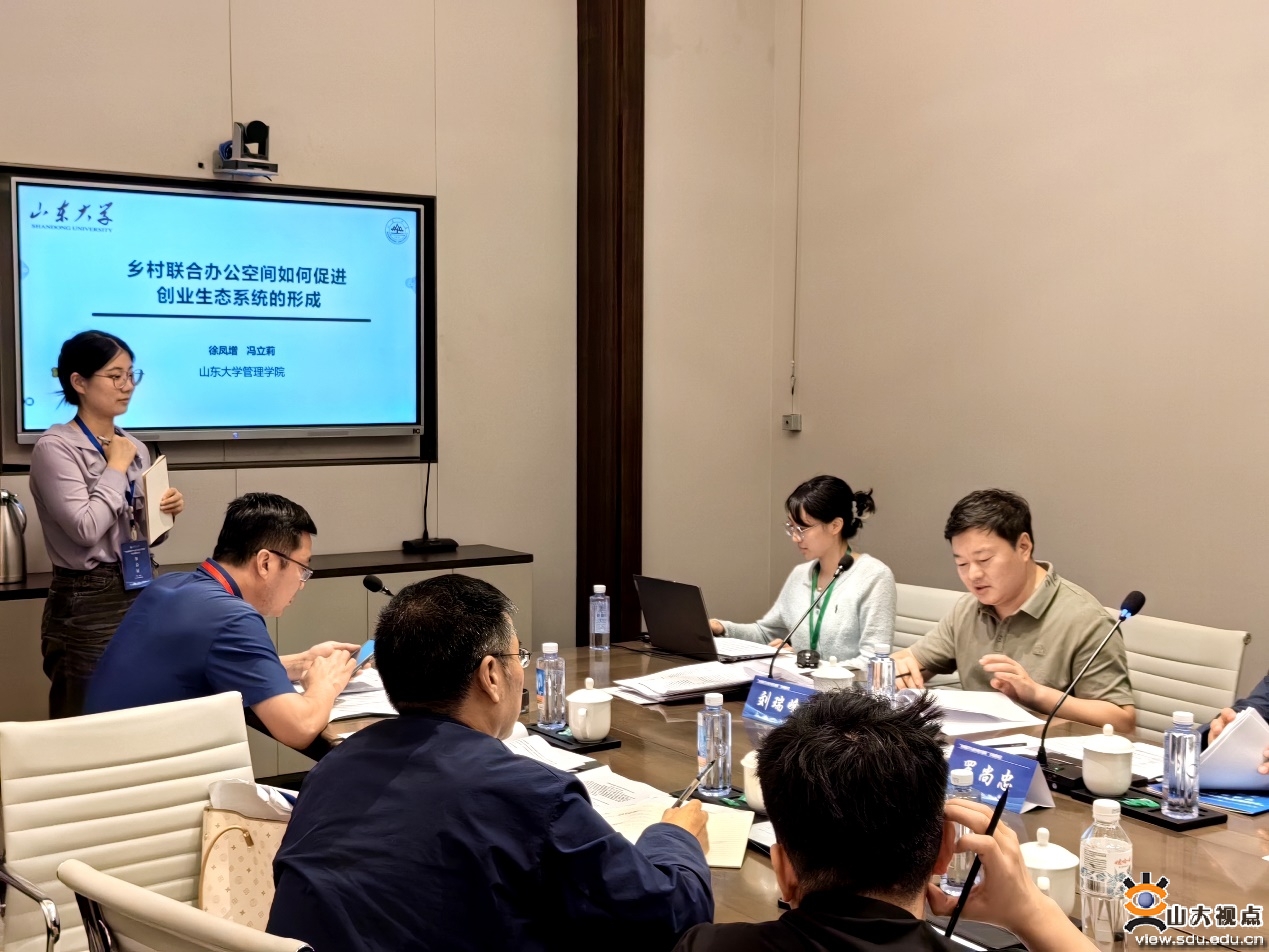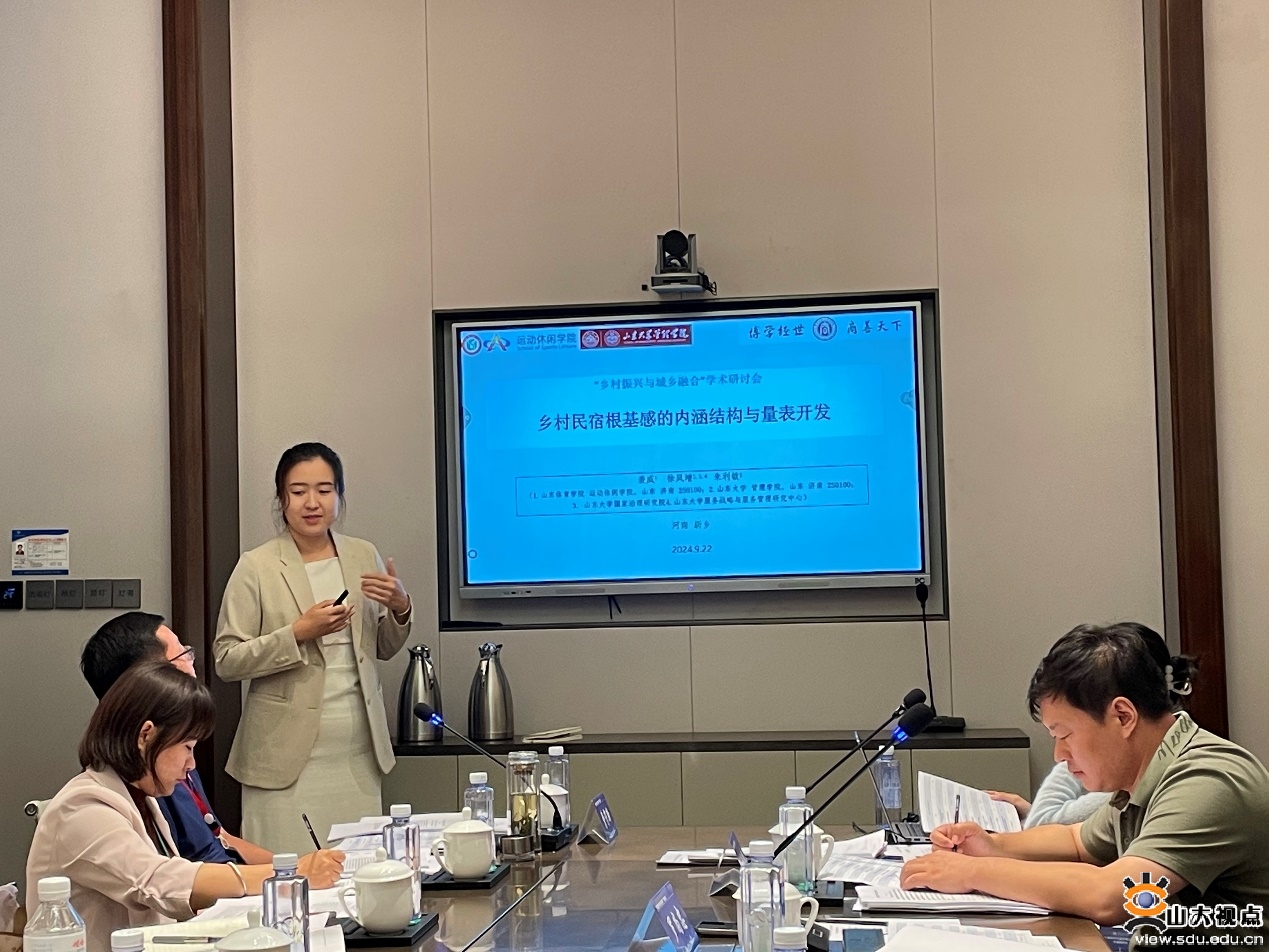 在分组研讨环节,五个分论坛分别围绕“乡村振兴与城乡融合”“乡村创业与三产融合发展”“数字经济与农村发展”“乡村农文旅深度融合”“新质生产力与可持续发展”展开研讨。研讨会期间,来自农业农村部、中国科学院、复旦大学、山东大学、北京师范大学、《南开经济研究》等高校及期刊编辑齐聚一堂,围绕党的二十届三中全会中关于城乡建设发展等内容进行学理阐释,开展学术研讨,凝聚学界共识。山东大学共有四篇入选论文参加分论坛并进行了现场汇报,分别是管理学院博士毕业生袭威和博士研究生朱利敏的“乡村民宿根基感的内涵结构与量表开发”,博士研究生冯立莉的“乡村联合办公空间如何促进创业生态系统的形成”,硕士研究生王展翼的“走向乡村产业振兴的人类行动者与非人类行动者转译过程研究”,硕士研究生吴祥民的“协同学理论视角下县域尺度乡村旅游目的地治理体系研究”。