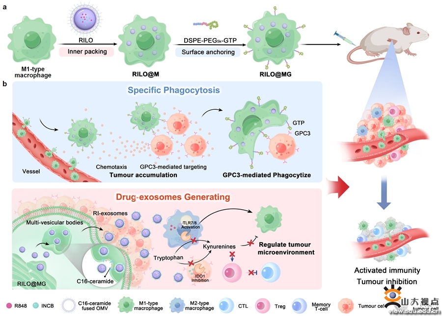 该论文设计了表面锚定Glypican-3靶向肽,内部携带肿瘤治疗药物的纳米编辑巨噬细胞制剂(RILO@MG)。锚定的靶向肽促进巨噬细胞制剂的肿瘤细胞识别功能,增强了高表达Glypican-3肿瘤细胞的特异性靶向和吞噬作用。内部携带共载TLR7/TLR8激动剂R848和吲哚胺2,3-双加氧酶1抑制剂INCB024360的纳米药物,该纳米药物包裹富含C16神经酰胺的外膜囊泡(RILO)。其中,外膜囊泡的包裹促使纳米药物通过小窝蛋白介导的内吞作用进入巨噬细胞制剂内部,C16神经酰胺能够通过诱导膜内陷和外泌体产生,促使巨噬细胞制剂携带的RILO通过外泌体形式释放。研究表明,RILO@MG在高表达Glypican-3的荷瘤小鼠模型中展现出优异的抗肿瘤效果。总的来说,该论文为研发治疗实体瘤的细胞制剂奠定了关键理论基础,有望丰富和发展临床现有细胞治疗手段。