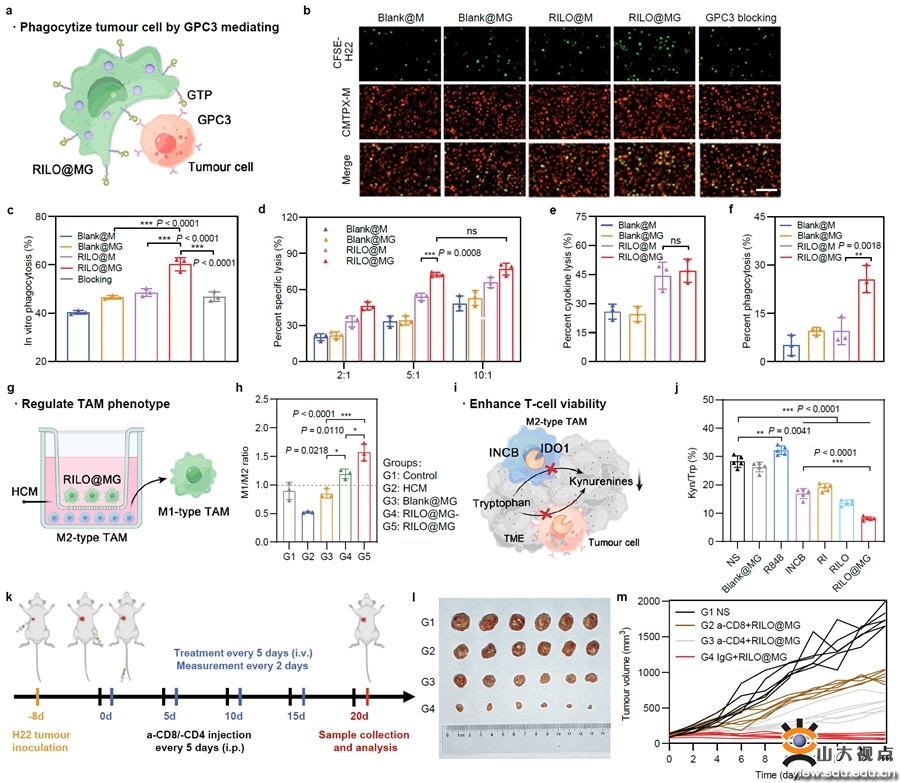 进一步地,RILO@MG通过表面锚定的Glypican-3靶向肽,实现肿瘤细胞的特异性识别、粘附、吞噬和杀伤;RILO@MG释放的RI-exosome含有R848和INCB024360,能够强化过继转输的巨噬细胞和肿瘤相关巨噬细胞维持抗肿瘤M1表型;同时,INCB024360能够降低犬尿氨酸与色氨酸百分比,增强T细胞活力。研究结果表明,RILO@MG在H22荷瘤小鼠模型、原位肝癌小鼠模型、再挑战肿瘤模型中均显示了良好的抗肿瘤效果。该论文的研究结果凸显了纳米编辑巨噬细胞制剂在促进抗肿瘤免疫反应并提高实体瘤疗效方面的关键作用,有望减少患者治疗成本与时间,提高患者可及性,具有广阔的临床应用前景。