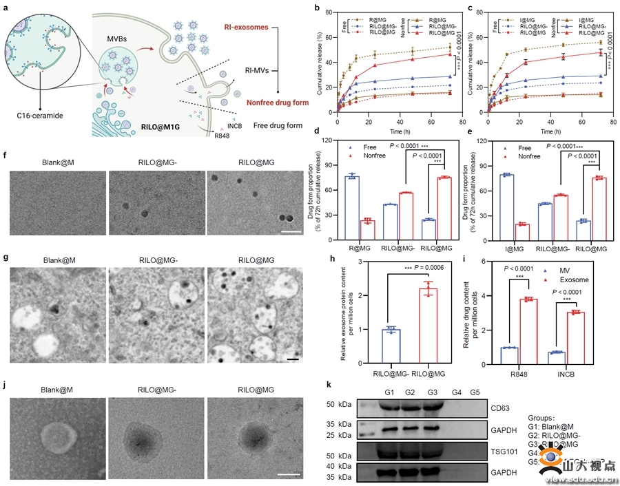 经静脉注射后,RILO@MG凭借巨噬细胞固有肿瘤趋向性和Glypican-3介导的肿瘤靶向作用,主动靶向并蓄积于肿瘤部位。在肿瘤部位,具有圆锥形结构的C16神经酰胺能够自发诱导膜中磷脂双分子层负向曲率,引起膜内陷,促进腔内囊泡形成,进而促使RILO@MG以外泌体形式释放纳米药物。通过RILO@MG药物释放曲线、胞内微观形态及释放液分离纯化等实验,进一步证实RILO@MG通过生成药物外泌体(RI-exosome)实现胞内纳米药物的释放。
