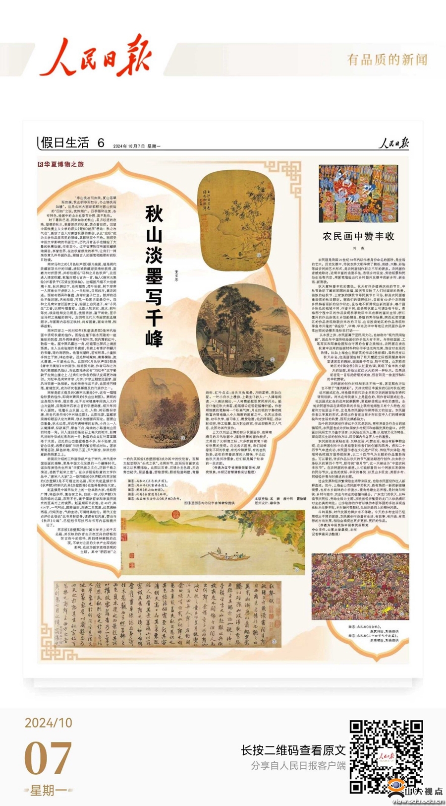 [本站讯]10月7日,中国民协中国农民画研究中心主任、山东大学机械工程学院设计学教授刘燕在《人民日报》第06版发表题为《农民画中赞丰收》文章。文章指出,在乡村振兴发展中,农民画总是紧贴生活、反映生活、礼赞生活,用画笔描绘当代乡村振兴发展中的新乡村、新生活、新面貌。农民画创作内容与方法是研究传统艺术造型和文化内涵的重要资料。这是刘燕教授于今年3月30日在《人民日报》第08版发表《巧思成“纹”花“饰”翻新》文章以来,再次以传统艺术造型研究为主题发表署名文章。