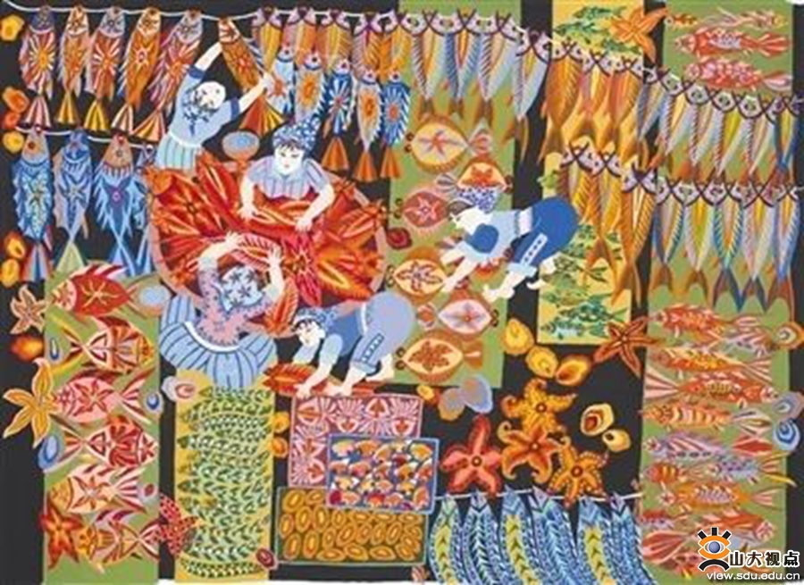 从本质上讲,农民画属于亚民间文化,也被称为“现代民间绘画”,因此与中国传统绘画创作手法大有不同。与传统国画、工笔写实和写意绘画知白守黑的含蓄之美相比,农民画在表达秋意中运用的绘画材料和创作手法无拘无束,饱含对生活的热情。比如上海金山张新英的作品《渔家酒》,虽然没有以秋天命名,但是画面绘制了秋天蟹肥之际酒菜摆桌等待宴请宾客的瞬间,画面静中带动、物中有情。山东胶南地区的《俏金秋》则以红蓝色调,展现了鱼市热火朝天的场面,彩绘出红红火火的另一种秋天。如果说前者是一首悠扬舒缓的夜曲,后者则是一曲直抒胸怀的丰收赞歌。
