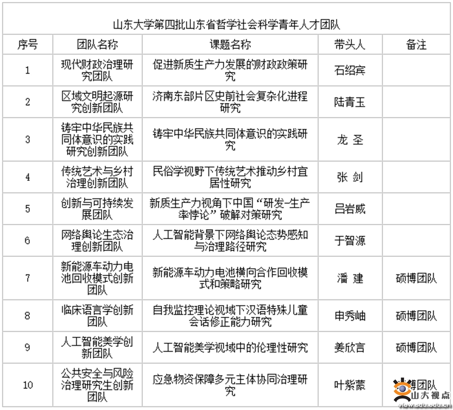 [本站讯]近日,山东省社科联公布第四批山东省哲学社会科学青年人才团队立项结果,山东大学共有10支科研团队入选。