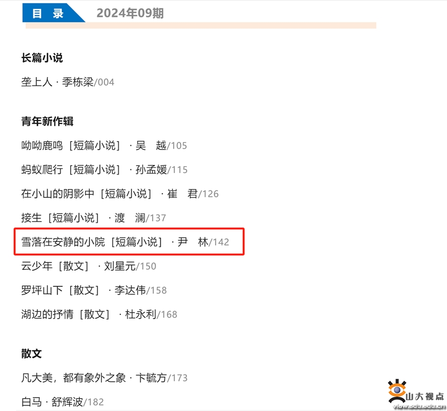 [本站讯]近日,《人民文学》“青年新作辑”栏目发表文学院研究员尹林题为《雪落在安静的小院》的短篇小说。