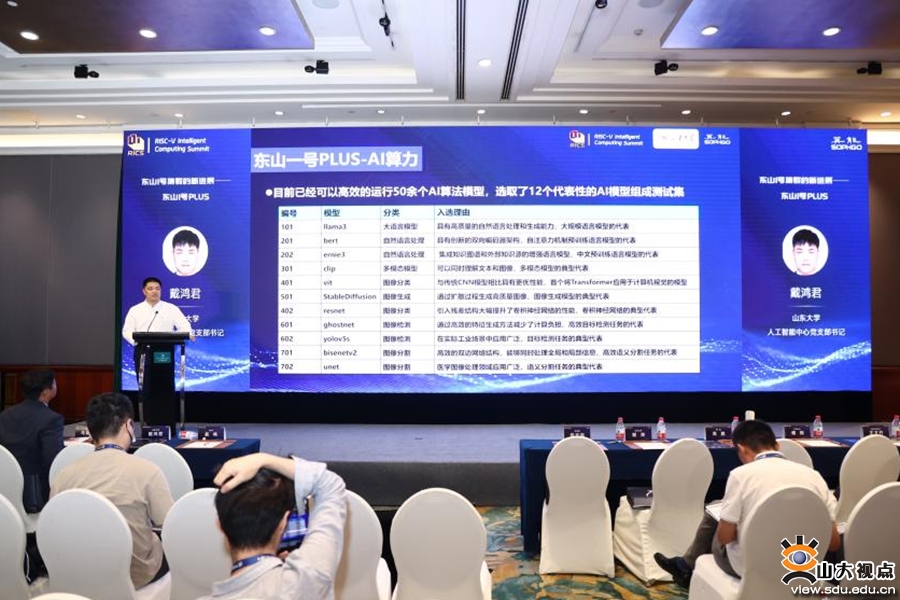 戴鸿君教授详细介绍了“东山一号PLUS集群”的性能,具有千兆电口—BMC、千兆电口—服务器、万兆光口—服务器3套网络,标准机柜具有6台计算节点和2台存储节点,单机柜算力达到476.8T FLOPS,存储达到126TB。对比“东山一号集群”,结合TPU和RAID扩展,“东山一号PLUS集群”的算力性能提升30倍,存储容量提升16倍,可高效运行50余个AI算法模型。这是继4月24日,世界首台使用RISC-V架构的服务器集群——“东山一号集群”在山东大学成功部署并正式发布以来,东山集群在智能算力和存储扩容方面的重大升级。