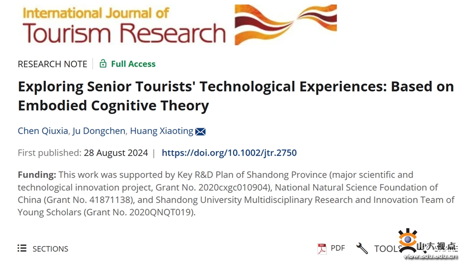 [本站讯]近日,管理学院黄潇婷教授的博士研究生陈秋霞在国际期刊International Journal of Tourism Research(SSCI,Q1,IF/2023: 4.1)在线发表及其团队最新研究成果“Exploring Senior Tourists' Technological Experiences: Based on Embodied Cognitive Theory”。黄潇婷教授为通讯作者,陈秋霞为第一作者,硕士研究生鞠东辰为第二作者,山东大学为第一作者和唯一通讯作者单位。