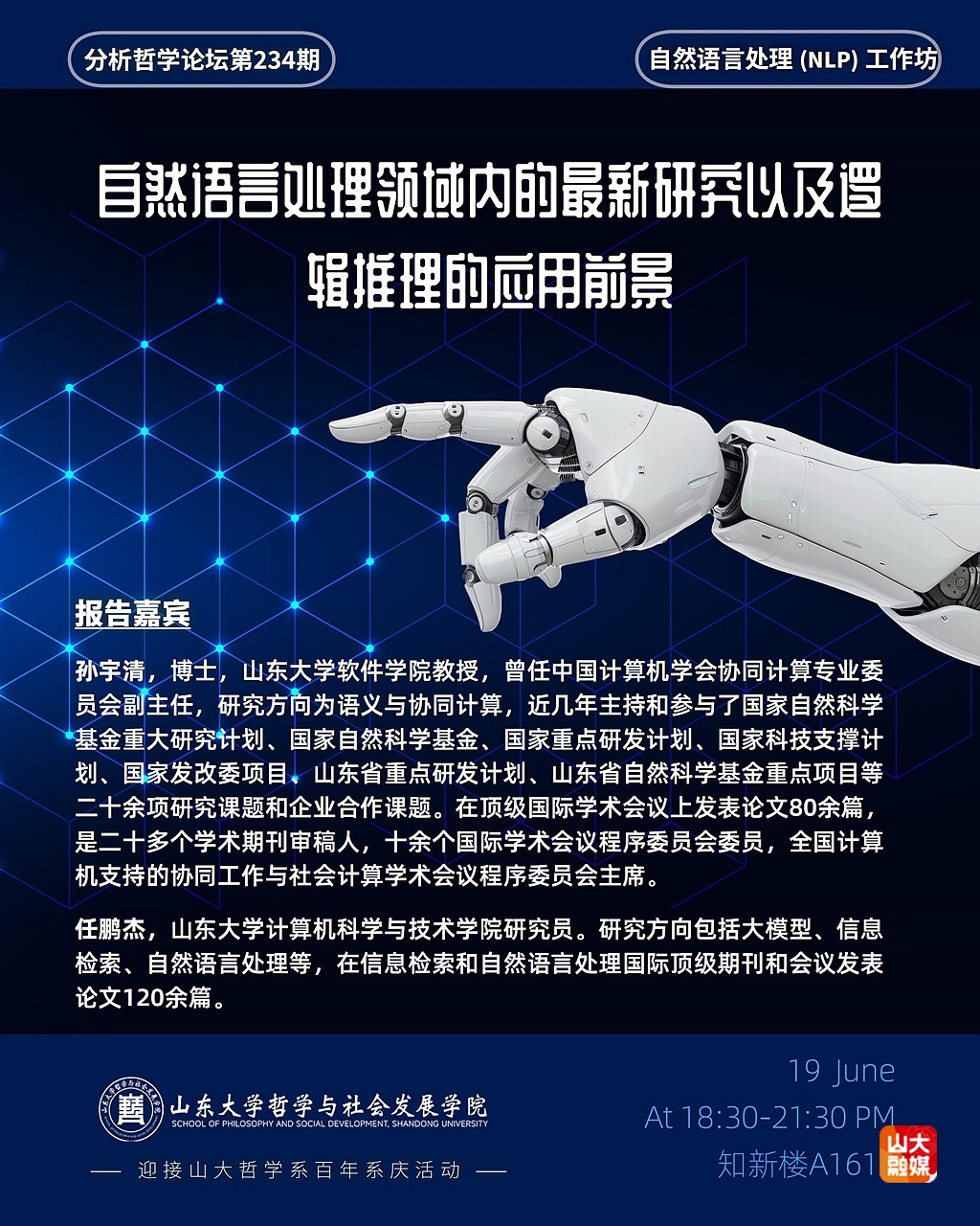 论坛主题为自然语言处理(NLP)小型工作坊,介绍自然语言处理领域内的最新研究以及逻辑推理的应用前景。会议将围绕自然语言处理展开讨论。