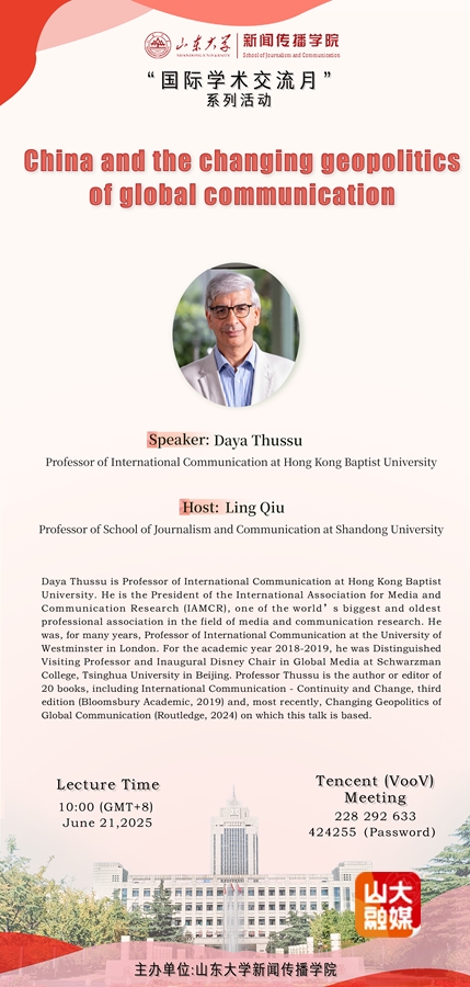 Daya Thussu, Professor of International Communication,Hong Kong Baptist University. He is the President of the International Association for Media and Communication Research (IAMCR), one of the world’s biggest and oldest professional association in the field of media and communication research. He was, for many years, Professor of International Communication at the University of Westminster in London. For the academic year 2018-2019, he was Distinguished Visiting Professor and Inaugural Disney Chair in Global Media at Schwarzman College, Tsinghua University in Beijing. Professor Thussu is the author or editor of 20 books, including International Communication - Continuity and Change, third edition (Bloomsbury Academic, 2019) and, most recently, Changing Geopolitics of Global Communication (Routledge, 2024) on which this talk is based.