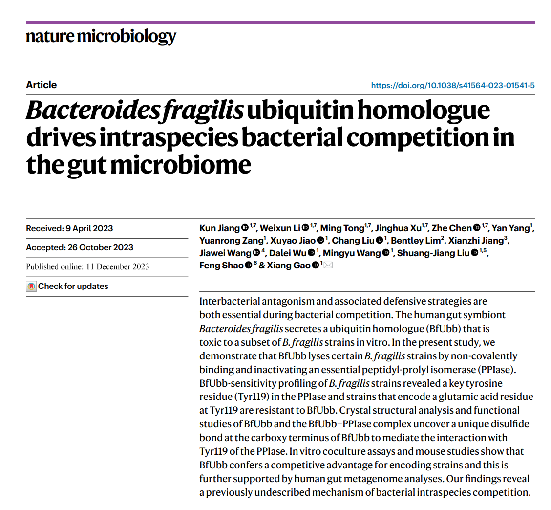 Initially, we tried several methods to elucidate the mechanism of action of BfUbb, including transposon screening, long-term evolution, and transcriptome sequencing, but were unable to identify the substrate of BfUbb. To my delight, through affinity purification coupled to LC-MS/MS, Kun found that a peptidyl-prolyl cis-trans isomerase (PPIase) emerged as a prominent BfUbb-interacting protein in the BfUbb-treated group. Through bioinformatics analysis and the toxicity changes of BfUbb to genetically engineered B. fragilis strains, we unexpectedly found that the sensitivity of B. fragilis strains to BfUbb could be identified only by analyzing the difference of glutamic acid (insensitive) and tyrosine (sensitive) at position 119 on PPIase. Crystal structure analysis also well verified that the unique disulfide bond at the C-terminus of BfUbb facilitates its binding to PPIase by orienting of Asp75 in BfUbb to interact with Tyr119 in PPIase from the BfUbb-sensitive strains. However, PPIases from BfUbb-insensitive strains bear a glutamic acid in place of the tyrosine, which likely exhibits significant electrostatic repulsion to Asp75 in BfUbb, and represents a substantial barrier to the formation of the BfUbb-PPIase complex, rendering the strains resistant to BfUbb. Bacterial co-colonization investigations in mice combined with human gut metagenomic analyses further suggest that BfUbb facilitates its encoding strains to gain significant fitness advantages in the complex human gut ecosystem through competitive intraspecies interactions