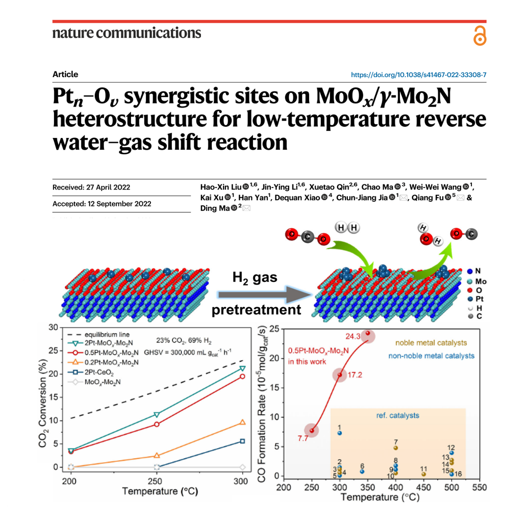 在这项工作中,首先将孤立的铂原子沉积到稳定在 γ-Mo2N 上的极薄层 MoO3 表面。随后,原位构建了含有大量铂簇氧空位(Ptn-Ov)的 Pt-MoOx/γ-Mo2N 催化剂。这种催化剂在低温(300 °C)反向水气变换(RWGS)反应中表现出无与伦比的活性和出色的稳定性。系统的原位表征表明,γ-Mo2N 表面的 MoO3 结构很容易被还原成 MoOx(2 < x < 3),然后产生足够的氧空位。铂原子与 MoOx 的氧原子结合,形成稳定的铂簇。这些高密度的 Ptn-Ov 活性位点大大提高了催化活性。这种构建金属空位协同位点的策略为开发高效的支撑催化剂提供了宝贵的启示。