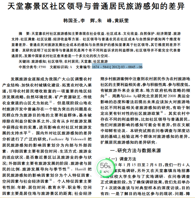 关键词: 旅游感知; 社区领导; 农村居民; 天堂寨; 社区旅游