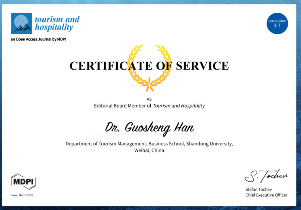 韩国圣,教授、企业管理博士生导师,南京大学博士,山东大学国际联络教授,主要从事人工智能与商务决策方面的教学与研究。主讲《商务分析》、《数据仓库与数据挖掘》、《大数据分析方法》、《高级计量与统计分析》(硕博士)、《SPSS及应用》。响应学校国际化战略,开发《实用论文写作:从想法到发表》海外师资课程,广受学生好评。主持国家社科基金、山东省社科规划项目、山东省人文社科基金、山东省文化艺术重点课题、山东省威海市人文社科重点课题等多项课题,参与国家社科重大项目、国家社科冷门绝学团队项目等多项课题。以第一作者或通讯作者发表70多篇学术论文,其中12篇SSCI论文、1篇EI期刊论文、7篇CSSCI论文;出版1部专著,参编2部境外教材与专著。受聘International Journal of Tourism and Hospitality 主编、国际SSCI一区期刊Tourism Geographies副主编、国际期刊International Journal of Adventure Tourism编委、CSSCI期刊《资源科学》客座组稿编辑、《中国生态旅游》编委;受聘为教育部研究生与学位办公室、CNKI硕博士学位论文匿名评审专家;受聘福建省正高级技术职务匿名评审专家(2022、2023)、河南省二层次B类人才匿名评审专家、宁夏大学、鲁东大学、华中师范大学、青海民族大学等研究生答辩委员会主席。被选为中国地理地理学会旅游地理专业委员会、中国生态学会旅游生态专业委员会委员、中国发展战略学研究会海洋强国专委会、山东省管理学会旅游管理专业委员会委员。