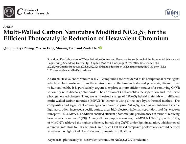 Title of Paper:Multi-Walled Carbon Nanotubes Modified NiCo2S4 for the Efficient Photocatalytic Reduction of Hexavalent Chromium