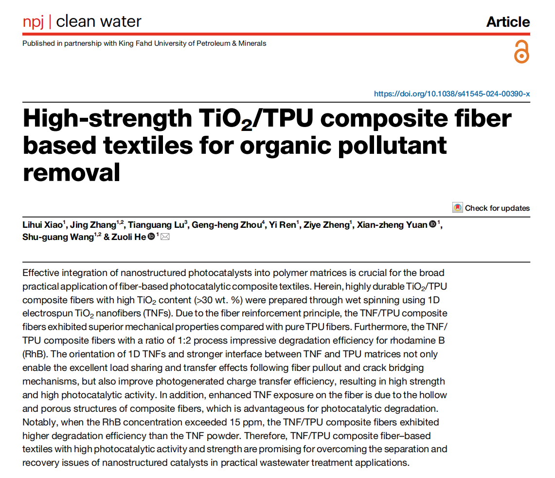 论文名称:High-Strength TiO2/TPU Composite Fiber Based Textiles for Organic Pollutant Removal
