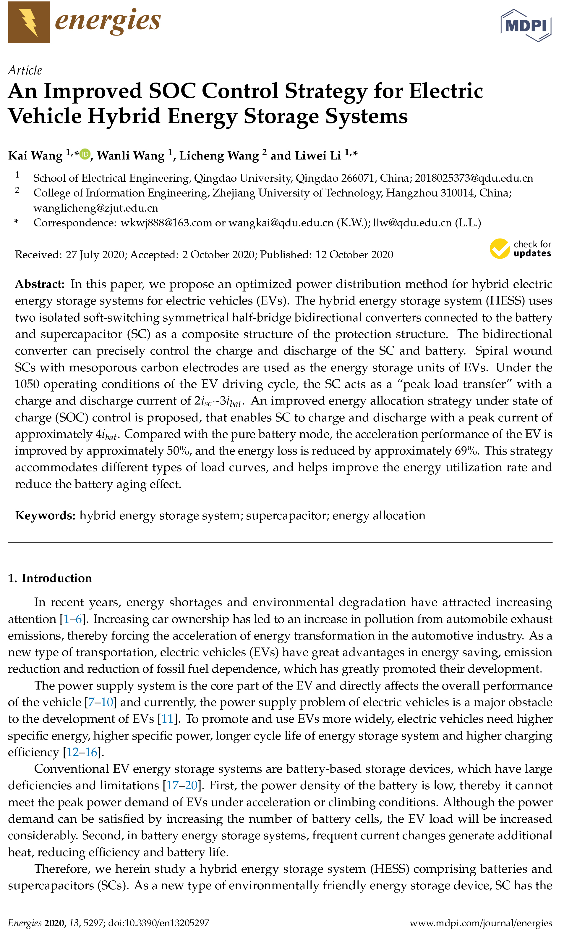 Title of Paper:An Improved SOC Control Strategy for Electric Vehicle Hybrid Energy Storage Systems